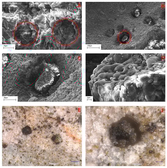 The influence of microorganisms on the weathering of limestone detected by SEM—clusters of yeast-like cells, site 2 (A), microcolonies of yeast-like cells, site 4 (B), microcolonies embedded in deep caverns, site 4 (C,D), samples from site 5 observed under Keyence Digital Microscope (E,F).