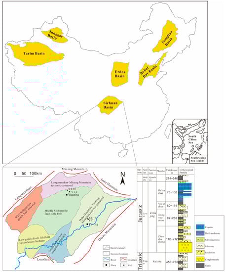 Regional structural map of the Sichuan Basin and a columnar section of the Jurassic Ziliujing Formation.