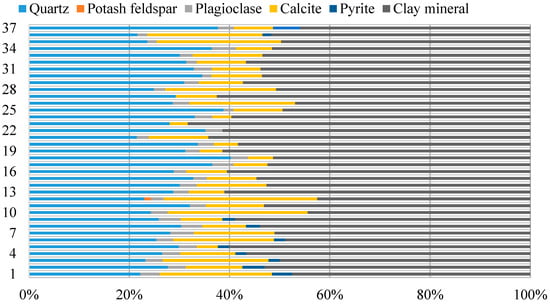 The mineral composition of continental shale in the Da’anzhai section of well FY1 is complex. Inorganic minerals are mainly composed of clastic minerals and clay minerals. Detrital minerals are mainly composed of quartz, feldspar, carbonate minerals, and pyrite. According to the mineral composition data (Figure 2), the clay mineral content is the highest, ranging from 42.5% to 68.3%, with an average of 54.3%, followed by quartz, which had a content distribution range of 21.5%–40.3%, with an average of 29.7%. The calcite content was high, with an average content of 12.14%, and the plagioclase content was relatively low, with an average of 3.01%. Other minerals’ contents comprised less than 1% of the total. However, the occurrence of a small amount of pyrite in continental shale indicates that the formation has experienced a certain period of hydrostatic anoxic reduction environment, which indicates that the sedimentary environment of continental shale in the Da’anzhai section is an anoxic reduction environment.