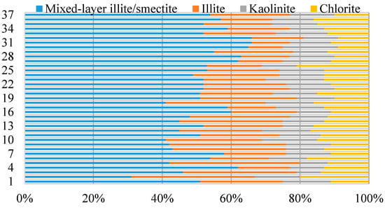 The clay mineral composition usually reflects the diagenetic evolution stage and sedimentary environment of shale, which is of great significance to the study of shale adsorption capacity and gas content [11]. The statistical analysis of the clay mineral composition of the Da’anzhai section (Figure 3) showed that the clay minerals of the continental shale in the Da’anzhai section mainly comprised an illite–montmorillonite mixed layer, along with illite, chlorite, and kaolinite. The montmorillonite content was low. The illite–montmorillonite mixed layer comprised between 31% and 66% of the total, with the average being 52%; the relative content of illite was between 10% and 38%, with an average content of 22%. The average relative content of chlorite was 13%. The average relative content of kaolinite was 12%. The content of illite–montmorillonite mixed layer and illite in the clay minerals of Da’anzhai shale was dominant. The content of the illite–montmorillonite mixed layer was large, which provided more adsorption sites and was conducive to the occurrence of adsorbed gas. The high content of illite indicated that the Da’anzhai shale in the Fuling area had entered the late stage of intermediate diagenesis.
