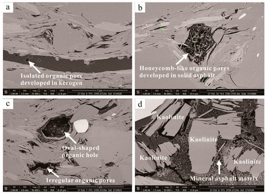 A mineral bitumen matrix is only found in a few samples in the Fuling area of the Sichuan Basin. The observation and analysis showed that the shale mineral bitumen matrix in the Da’anzhai section was secondary organic matter, which was mainly the product of microbial degradation in the early diagenesis stage of sedimentation and the hydrocarbon immersion adsorbed and bound by minerals. As is shown in Figure 5d, shale organic matter was wrapped in kaolinite booklets, and a large number of nanoscale pores were developed inside. Most of the organic matter pores in solid asphalt were formed by liquid oil solidification, cracking, gas accumulation, or residual pores after gas escape. The organic matter carrier in the pore had no fixed shape, and the organic pores were oval and star-shaped, with pore diameters of between 4.5 nm and 350 nm.