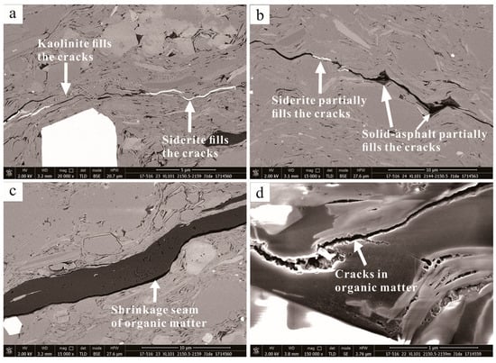 Observation and analysis with an argon ion polishing–scanning electron microscope showed that there were nano-millimeter microcracks in the shale samples of the Ziliujing Formation in the Fuling area of the Sichuan Basin, which were mainly the result of mechanical genesis. Such microcracks are formed by tectonic stress or local stress during diagenesis [18]. They are mostly curved or elongated in shape. They are tensile microcracks with certain directionality formed under the action of tectonic fractures. The width of the fracture was 105 nm to 5 microns. The microcracks in some samples were filled with asphalt, kaolinite, and siderite (Figure 6a,b). The microcracks of Da’anzhai shale with large burial depths were more developed, which may be related to the increase in shale burial depth and the deepening of the diagenetic evolution of clay minerals. In addition to the above mechanical microcracks, it could also be observed in some electron microscope photos that there were organic matter shrinkage fractures at the edge of the organic matter in Da’anzhai shale (Figure 6c), as well as organic matter internal fractures (Figure 6d). The width of microcracks ranged from 100 nanometers to tens of microns.