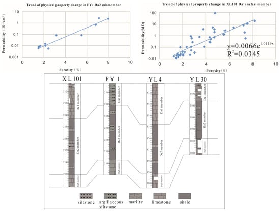 The continental shale in the Da’anzhai section of the Lower Jurassic Ziliujing Formation in Sichuan Basin was characterized by low porosity and permeability. According to the test results of 89 shale core samples from wells FY1, FY4, and XL101, the porosity of continental shale was 1.21%–8.37%, with an average of 4.13%. The permeability of continental shale was 0.006 × 10−3 μm2–3.887 × 10−3 μm2, with an average 0.2349 × 10−3 μm2. According to the statistical results, the physical property change trends of Wells FY1, FY4, and XL101 in the Fuling area are shown in Figure 7. The average porosity was 1.91%, and the average permeability was 0.1233 × 10−3 μm2 in the Da’anzhai section of Well FY1. The porosity and permeability were positively correlated. The average porosity of the Da 2 sub-member was 3.34%, and the physical properties were much better than the entire Da’anzhai section. The porosity and permeability of the Da’anzhai section of Well FY4 were positively correlated, and the porosity gradually decreased with depth, indicating that the compaction controlled the change of shale pores at this time. If the Da’anzhai shale was buried 3500 m or deeper, the porosity decreased first and then increased with an increase in depth. The former may be due to the influence of compaction, and the latter may have been caused by clay mineral transformation, organic matter hydrocarbon generation, and microcracks.