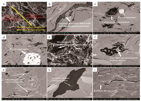 Compaction is the most important reason for the reduction in porosity in the early stage of shale deposition, which plays a destructive role in the preservation of pores and runs through the whole process of burial diagenesis to uplift table rock evolution [21]. Under the influence of compaction, the following changes took place in shale: the original fluid discharge and the original intergranular pore volume greatly reduced, and the physical properties deteriorated; under stress, the particles were oriented as shown in Figure 8a. Compaction elicits different responses from different particles. Plastic mineral particles were deformed by compaction, and primary pores basically disappeared. The rigid particles had a certain resistance to compaction and supported each other to form a framework so that the filled organic matter and pores were not affected by extrusion and retained a certain number of primary pores [22,23].