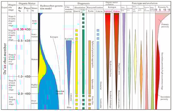 (2) The diagenesis of shale mainly includes compaction, cementation, dissolution, replacement, the transformation of clay minerals, and the thermal maturity of organic matter, which are related to and influenced by each other. According to the reflectance Ro of the organic vitrinite of continental shale, the diagenetic evolution of Da’anzhai shale experienced early diagenetic stage A and B and middle diagenetic stage A and B. The mixed layer of illite and montmorillonite in continental shale has undergone a process from disorder to order, involving the occurrence and transformation of kaolinite, the occurrence of inorganic acid and organic acid successively, a change in porosity from primary to secondary, and a change in the sediment from loose to consolidated to dense. At present, the Da’anzhai shale is in the middle diagenetic B stage, and the organic matter is in the high maturity stage.
