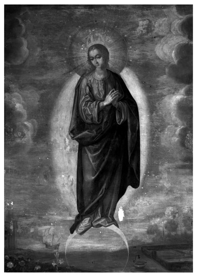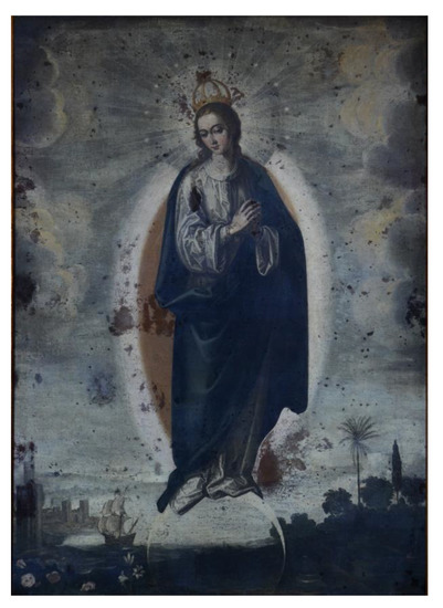 - Escobar Correa, J.G. Ave Maria Gratia Plena: Oconología e Iconografía de la Inmaculada Concepción; Universidad Nacional de Colombia: Bogotá, Colombia, 2012. [Google Scholar]