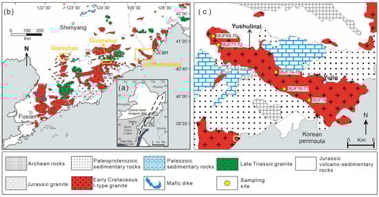 (a) Simplified geological map of eastern China; (b) Simplified geological map showing the location of the study area and the distributions of the Mesozoic intrusions in the Liaodong Peninsula; (c) Geological map of the Yushulinzi pluton showing the sample sites.
