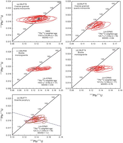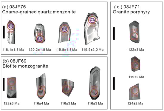 The CL images show that the zircons extracted from the coarse-grained quartz monzogranite are euhedral prismatic crystals with lengths of greater than 100 μm, and they exhibit evident oscillatory zoning (Figure 3a). These zircon grains have high Th/U ratios of 0.7–1.8, suggesting a magmatic origin. The U-Pb age of sample 08JF76 (coarse-grained monzogranite) was determined using the zircon SIMS U-Pb method. Twenty analyses of zircons formed yielded a weighted mean 206Pb/238U age of 119.8 ± 0.9 Ma (2σ, n = 20) (Figure 4a). Sample 08JF78 was dated using the zircon LA-ICP-MS U-Pb method, and sixteen analyses of zircons yielded a weighted mean 206Pb/238U age of 120.7 ± 1.4 Ma (2σ, n = 16) (Figure 4b). This is virtually coeval with the U-Pb age of 119.8 ± 0.9 Ma (2σ, n = 20) for sample 08JF76 within the errors, so they both provide the best approximation of the crystallization age of the coarse-grained quartz monzogranite.