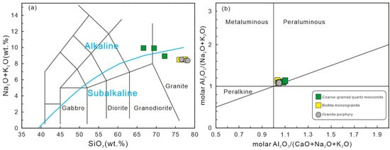 Diagrams of (a) Na2O + K2O vs. SiO2 (TAS) and (b) A/NK [molar ratio Al2O3/(Na2O + K2O)] vs. A/CNK [molar ratio Al2O3/(CaO + Na2O + K2O)] for the coarse-grained quartz monzonite, biotite monzogranite, and granite porphyry samples from the Yushulinzi pluton in the Liaodong Peninsula.