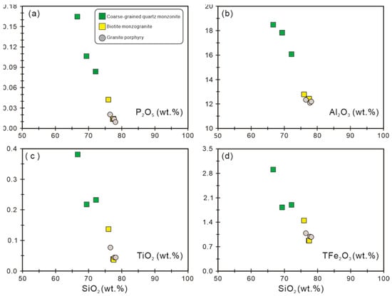 Diagrams of SiO2 versus (a) P2O5, (b) Al2O3, (c) TiO2, and (d) TFe2O3 for the coarse-grained quartz monzonite, biotite monzogranite, and granite porphyry samples from the Yushulinzi pluton in the Liaodong Peninsula.
