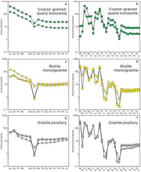 Chondrite-normalized REE patterns (a,c,e) and primitive mantle (PM)-normalized trace element spider diagrams (b,d,f) for the coarse-grained quartz monzonite, biotite monzogranite, and granite porphyry in the Yushulinzi pluton in the Liaodong Peninsula. The chondrite and primitive mantle values are from Sun et al. [76].