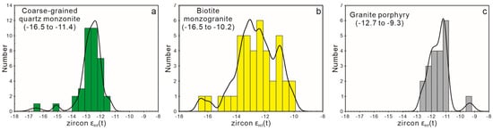 Histograms of the zircon εHf(t) values of the (a) coarse-grained quartz monzonite, (b) biotite monzogranite, and (c) granite porphyry in the Yushulinzi pluton in the Liaodong Peninsula.