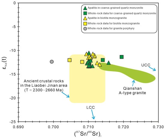 Plot of εNd(t) vs. (87Sr/86Sr)i for apatite grains extracted from the coarse-grained quartz monzonite and biotite monzogranite in the Yushulinzi pluton. The green and yellow squares and a gray circle represent the whole-rock Sr-Nd isotopic compositions of the coarse-grained quartz monzonite, biotite monzogranite, and granite porphyry, respectively. The data for the upper continental crust (UCC) and lower continental crust (LCC) are from [8,44,77]. The data for Qianshan A-type granites are quoted from Yang et al. [44]. The data for the ancient crustal rocks in the Liaobei-Jinan area are from [30,78,79].
