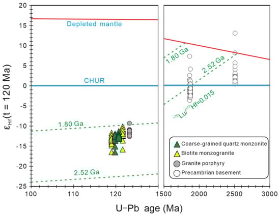 Plot of zircon εHf(t) value versus U-Pb age for the coarse-grained quartz monzonite, biotite monzogranite, and granite porphyry in the Yushulinzi pluton. All of the εHf(t) values were calculated from the zircon U-Pb ages. The data for the Precambrian basement are quoted from the literature [84,85,86,87].