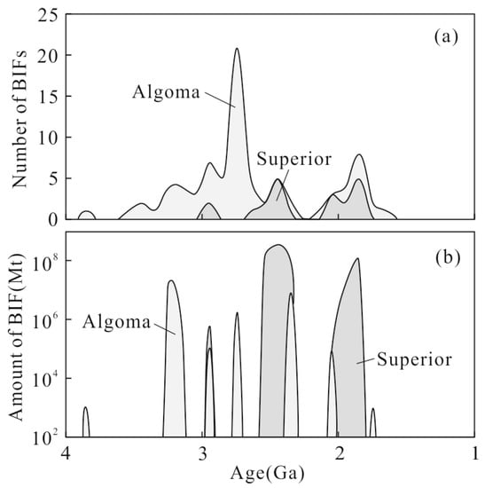 Comparison diagram in the number (a) and abundances (b) of Algoma-type and Superior-type BIFs through time (modified after Huston et al., 2004).