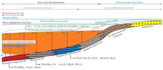 Substantial evidence supports the claim that the Earth’s ancient atmosphere was anoxic in the Precambrian period, such as the sulfur isotope nonmass fractionation equilibrium [33,116,117]; the ratios of iron, molybdenum, and carbon isotopes in sediments [118]; the absence of a red layer; and the Fe2+-dominant leaching products in paleosoils [119]. There are various opinions on the mechanism of early Precambrian BIFs regarding submarine hydrothermal venting. Based on the studies of modern ocean sediments, there are two main points: (a) Ocean upwelling current: the BIF sedimentary site is relatively independent from the seawater from which its material originates [120], and the hydrothermal minerals are brought to shallow sea or craton margin deposition through the upwelling of ocean current [73]. (b) Convection and circulation of seawater: hot fluids, consisting of marine and connate water leaching iron, silica, and other elements from mafic and ultramafic rocks associated with mantle plumes or mid-oceanic ridges and active spreading centers are released into the ocean at underwater hot springs (black smokers). On contact with cold marine water, the least soluble elements are precipitated in the form of colloidal hydrous silicates (clay minerals) and hydroxides close to the hydrothermal vent. The hydrothermal fluids are high in silica and low in alumina, causing the precipitation of alumina-poor iron silicates (nontronite) that dissociate into iron hydroxide and amorphous silica during diagenesis. The amorphous silica is typically entrapped by iron oxide laminae to form bands of chert. Breaches of the iron oxide laminae permitted the escape of the gelatinous amorphous silica during compaction and dewatering, leaving a chert-free residue as the protore of non-hydrothermal sedimentary high-grade iron ore [86,121,122]. Smith et al., (2013) [92] studied the BIFs of the ancient West Rand in South Africa and found that the sedimentary sequences were hematite–magnetite associations, magnetite–siderite and siderite from bottom to top, indicating that hematite–magnetite associations were deposited at the farthest end of the basin, while magnetite–carbonate and mudstone were deposited near the coast. The West Rand BIFs was formed during the maximum marine transgression, when the deep hydrothermal fluid surged up below the upper transmittance zone and in turn would trigger BIF deposition. Fe-oxidizing bacteria produce limited oxygen at the interface between the hydrothermal column and the surrounding seawater, and Fe2+ is oxidized to form the original Fe(OH)3, which either precipitates on the seafloor or was reduced to ferric ion by the action of the hydrothermal column. At the far shore end, the ferric hydroxide was converted to hematite during the later diagenetic compaction process and was preserved. Magnetite was formed when hydrothermal columns came into contact with seafloor sediments; by the nearshore side, Fe(OH)3 is transformed into Fe-rich carbonate minerals with the addition of organic carbon, and in the nearshore shelf, Fe-rich aluminosilicate minerals were formed with the increasing contribution of terrigenous detrital materials significantly. Above the hydrothermal columns, some iron-poor detrital deposits occurred. Accordingly, the following BIFs sedimentary model could be established (Figure 3). This model reflects the changes of hematite–magnetite BIFs from the lowest and furthest part of the basin to the top and near the coast, from magnetite–siderite to siderite BIFs of carbonate facies, then to iron mudstone, iron mudstone siltstone, and finally to continental sandstone. At a certain depth of the basin, due to neutral buoyancy [87], the deep reduction in iron-rich hydrothermal liquid upwelled below the upper photic zone, resulting in hematite–magnetite BIF deposition. In the distal part of the basin, where the base of the plume was not contact with the sediment and siliciclastic input was minimal, the ferric oxyhydroxides would be transformed to and preserved as hematite in hematite-bearing iron formation. Where the plume was in contact with the sediment and organic carbon input was limited, the ferric oxyhydroxides would be transformed to magnetite by the Fe2+ in the plume in a nonredox reaction, as proposed by Ohmoto (2003) [123], and magnetite-bearing iron formation would be preserved. Closer to the coast, where the plume was in contact with the sediment and organic carbon input was higher, but still with limited siliciclastic input from the coast, the oxidation of organic carbon through the reduction in hematite would have led to the formation of siderite and/or ankerite along with magnetite formed by iron respiration in the presence of organic matter and/or the addition of dissolved Fe2+ from plume water. Above the top of the hydrothermal plume in the shallower, more proximal parts of the basin, there was very little iron input into the sediment, and only iron-poor mudstone, siltstone, and sandstone were preserved.