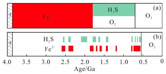Evolution of Earth’s marine conditions through time (modified after [126]). (a). Classical models of the chemical composition of the deep ocean. (b) Distribution of Precambrian euxinic and ferruginous deep waters, based on the shale record.