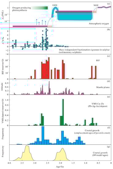 Summary of atmospheric oxygen concentration (a), Δ33S values of sulfides (b), the age distribution of BIF (c), VMS deposits (d), mantle plumes (e), and juvenile crust (f,g) for the Precambrian era. (a) Evolution of Earth’s atmospheric oxygen concentration through time. The purple curve shows a classical, two-step view of atmospheric evolution, while the blue curve shows the emerging model (after [33]). (b) Plot of Precambrian Δ33S values of sulfides (after [35]). (c) Secular trend in the distribution of Precambrian BIF (after [3]). (d) Distribution of mantle plumes (after [3]), y-axis (height) is the sum of Gaussian time series for high-Mg intrusive rocks and layered intrusions, flood basalts, and dikes. (e) The distribution of VMS deposits over time (after [3]). (f) Distribution of U-Pb zircon ages for pre-1.0 Ga juvenile crust (after [35]). (g) Gaussian probability distribution of Hf model ages for zircons of pre-1.0 Ga (modified after [35]).