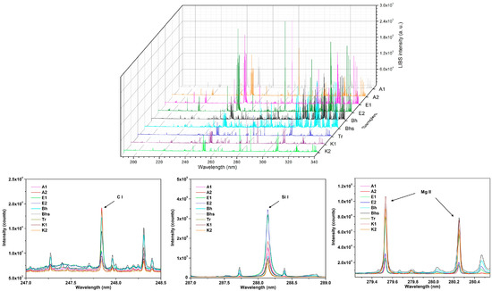 The emission lines of the elements C (247.86 nm), Fe (259.940 nm), Mg (279.55, 280.27, and 285.213 nm), Si (288.16 nm), Al (308 and 394.40 nm), Ti (375.93 nm), Ca (393.36 and 422.67 nm), and K (766.49 and 769.90 nm) were identified in the LIBS spectra of soils from the various horizons (Figure 1 and Figure S1—Supplementary Materials) and are reported in Table 1, and their relative emission intensities (in arbitrary units, a.u.) are shown Figure 2.