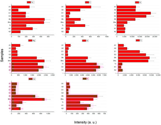 The relative emission intensity of the Fe line varied along the profile with evidence of accumulation in the Bh and Bhs horizons, which confirms that the accumulation of this element may be associated with the formation process of these types of spodosols [6]. As expected, the C emission line showed the highest relative intensity in soils from the surface horizon (A1 and A2), with a tendency to decrease and then accumulate again in the Bh and Tr horizons [4,21,22]. Differently, the Si emission line intensity was the highest in the E horizons, whereas the intensity of the Mg and Al emission lines appeared to follow a similar trend along the profile with the highest values for soils from deeper horizons where clay predominates [4]. The Ti emission line intensity was the highest in the Bh and E horizons, which suggests the large presence of titanium oxide in these horizons [4]. Additionally, the emission line intensity of Ca was the highest in the Bh horizons, whereas the highest intensity of the K lines was featured in the Bh and Bhs horizons and the K horizons, which may be attributed to the presence of large amounts of quartz, kaolinite, and anatase [4].