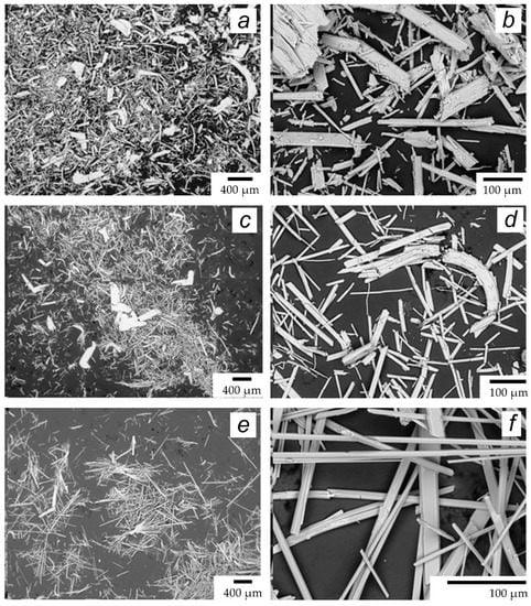 SEM images of calcium sulfate crystals, isolated from I (a,b), III (c,d), and V (e,f) samples from blank experiments.