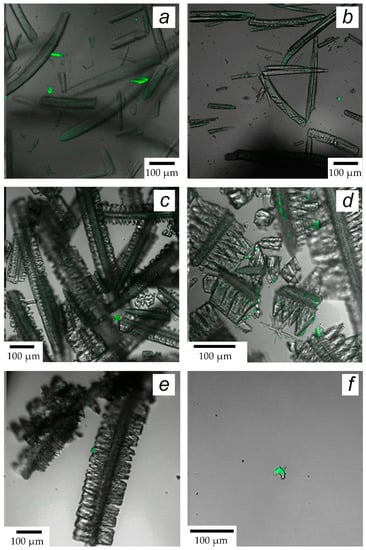 Two-dimensional images of calcium sulfate crystals in equilibrium with mother liquor in the presence 10 mg·dm−3 of PAA-F1 in Ia (a,b), IIa (c), IIIa (d), Va (e) and Va (f) samples. The green color indicates location of PAA-F1.