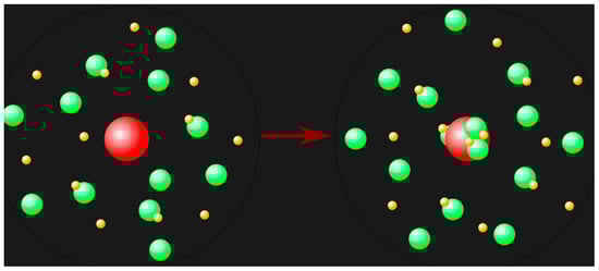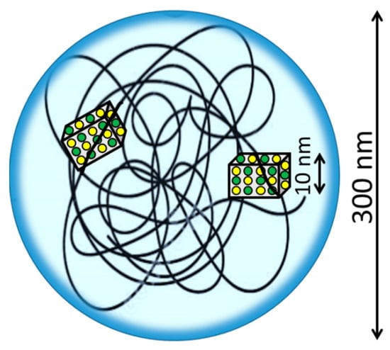 It is then quite natural that the solid impurities would serve as centers of heterogeneous bulk nucleation of calcium sulfate, Figure 6. This figure presents the proposed scheme of such nucleation with the actual scale of the dimensions in the drawing: the red sphere corresponds to the idealized nanoimpurity particle with a diameter of 1 nm, while the yellow and green spheres symbolize Ca2+ and SO42− ions, respectively. The associated yellow and green spheres represent [CaSO4]0 complexes. Obviously, any solid impurity particle is capable of adsorbing several [CaSO4]0 and/or Ca2+ species, and initiating the further formation of calcium sulfate nuclei. Such a scheme is in good agreement with the heterogeneous mechanism of the bulk nucleation of sediments [53,54], which is energetically much more favorable than the spontaneous homogeneous one. In our opinion, it is the most realistic and well-founded explanation for our experiments.