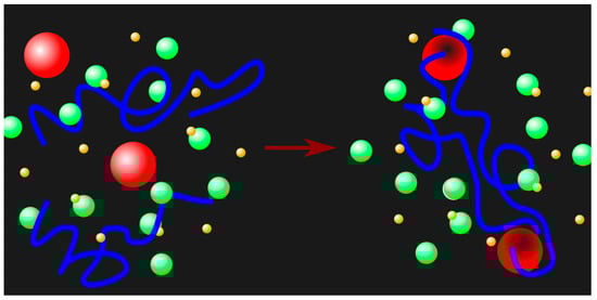 The possible idealized scheme of solid impurities (red spheres) being blocked by PAA-F1 molecules (blue ribbon); green spheres correspond to sulfate ions, yellow spheres—to calcium cations.