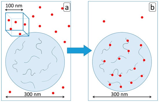 The proposed scheme of antiscalant efficacy due to sorption of solid impurities by aggregates of FAA-F1 molecules before (a) and after (b) the sorption takes place; red circles correspond to solids with the size of 1 nm, and blue ribbons correspond to PAA-F1 molecules (the size of solid impurities in the picture has been increased tenfold for better visibility, and the size of antiscalant has been increased three times).