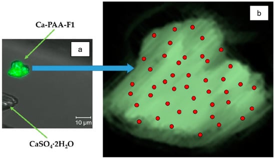 Two-dimensional fluorescence image of CaSO4·2H2O and Ca-PAA-F1 solids in the Ia experiment (a), and the proposed scheme of foreign nanoimpurities (indicated by red circles) accumulation by Ca-PAA-F1 particles (b).