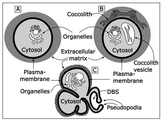 Foraminifera build a new chamber in an extracellular compartment termed delimited biomineralization space (DBS). Since the DBS is extracellular it is, in principle, open to seawater. The term “delimited” was chosen because the general consensus is that the DBS is partly closed to seawater and represents a spatially defined volume in which chamber growth can be controlled [18,19]. The DBS is formed by the pseudopodial network of foraminifera [20]. Pseudopodia are dynamic cell protrusions used for various purposes such as feeding, locomotion, and chamber formation. In contrast to the CV in coccolithophores, it is unclear whether the DBS volume is sufficient to contain all raw material required for chamber formation. It is generally assumed that this is not the case and that vesicles provide a pool of Ca and inorganic carbon. Whether this pool is sufficient for chamber formation is also debated [21,22,23].