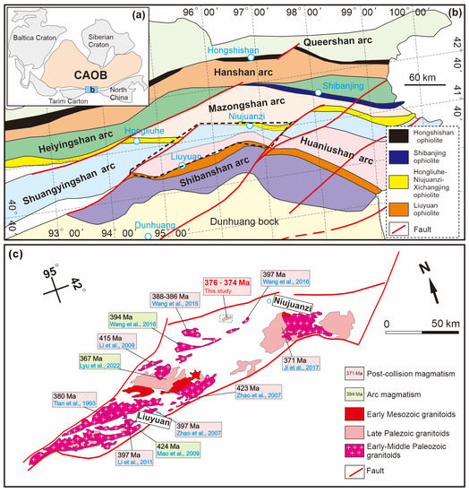 The BOB is located in the Southern CAOB and the Northern Dunhuang Block (Figure 1b) and is made up by a few Mesoproterozoic to Neoproterozoic microcontinents, Paleozoic felsic–mafic magmatic and volcaniclastic rocks, sedimentary stratal, and ophiolitic mélanges [11,15,17,20,29,43,44,45,46]. From north to south, four major ophiolite belts (Hongshishan ophiolites, Mingshui–Xiaohuangshan ophiolites, Hongliuhe-Niujuanzi-Xichangjing ophiolites, and Liuyuan ophiolites) divide the BOB into the Queershan arc, Hanshan arc (Hanshan–Heiyingshan arc), Mazongshan arc, Huaniushan arc (Huaniushan–Shuangyingshan arc), and Shibanshan arc (Figure 1b) [20].