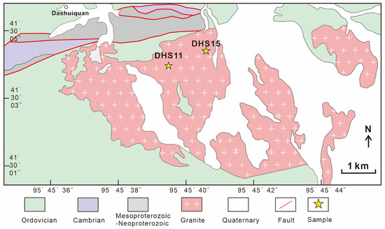 The Duhongshan pluton addressed in this paper is located on the Northern Huaniushan arc (Figure 1c), covering an area of around 30 km2. It is mostly composed of monzogranite and intrudes into the Ordovician siliceous rocks. Two samples (DSH11 and DSH15) were collected for geochronological studies and fourteen samples for geochemical investigations (Figure 2). The Duhongshan granite is of light flesh-red color, medium- and coarse-grained and has a massive structure (Figure 3a,b). The samples consist mainly of the quartz (45 vol%), K-feldspar (25 vol%), plagioclase (20 vol%), biotite (~5 vol%), and a small amount of amphibole (<5 vol%) (Figure 3c). The K-feldspar and plagioclase grains are euhedral clinopyroxene. The biotite and amphibole from irregular crystals, filling in the spaces between the grains of quartz and feldspar showing late recrystallization (Figure 3c,d).