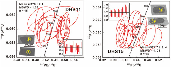 Concordia diagrams for samples DHS11 and DSH15 from the Duhongshan granites. Cathodoluminescence images for two zircons from each sample are also known.