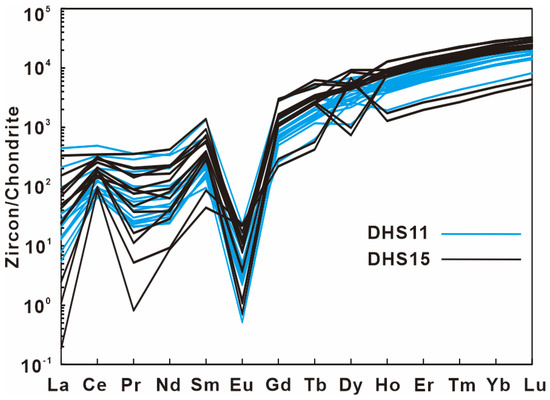 Chondrite−normalized rare earth element pattern for zircon from the Duhongshan granites. Chondrite values from [60].