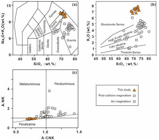 Major element diagrams for granitoids from the middle Huaniushan arc. (a) Na2O + K2O vs. SiO2 diagram [62]; (b) SiO2 vs. K2O diagram [63]; (c) A/NK vs. A/CNK diagram [64]. Geochemical data of post-collision and arc magmatism from [15,18,22,23,24,25,26,27,28].