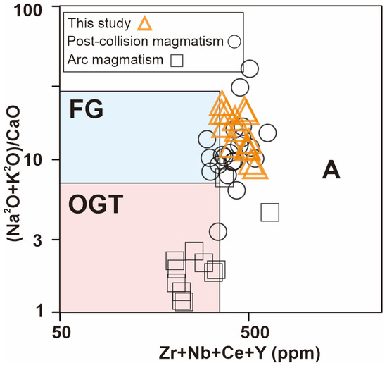 Discriminant diagram for type of granites from the middle Huaniushan arc in the BOB [61]. Geochemical data of post-collision and arc magmatism from [15,18,22,23,24,25,26,27,28]. FG = fractionated felsic granites; OGT = unfractionated I- and S-type granites; A = A-type granite.