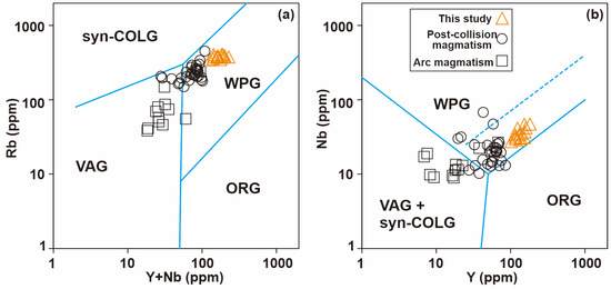 Geotectonic discrimination diagrams of granitoids from the middle of the Huaniushan arc. (a) Rb vs. Y + Nb diagram [65]; (b) Nb vs. Y diagram [65]. Geochemical data of post-collision and arc magmatism from [15,18,22,23,24,25,26,27,28]. Syn-COLG = syn collisional granite; VAG = volcanic arc granite; WPG = within-plate granite; POG = post-orogenic granite; ORG = oceanic ridge granite.