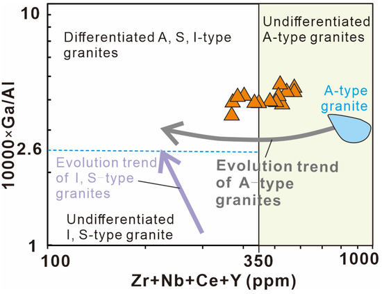 10,000 × Ga/Al vs. (Zr + Nb + Ce + Y) diagram of the samples plot from the Duhongshan granites [71].