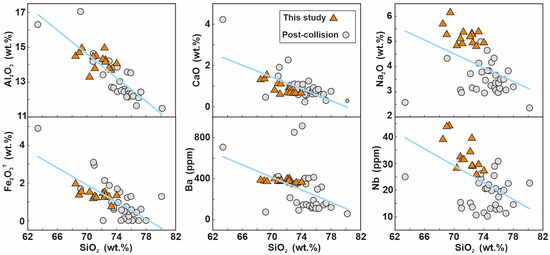 Harker diagrams for granitoids from the middle Huaniushan arc. Geochemical data of post-collision from [18,22,23,24,25,26].
