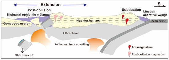 Combined with the reported data, we developed a tectonic evolution model for the Southern BOB, shown in Figure 12. At this time, the main tectonic units in the south of the BOB are the Gongpoquan arc, the Huaniushan arc (microcontinental block), the HNXO (Niujuanzi ophiolitic mélange), and the Liuyuan Ocean (Liuyuan accretive wedge). From the end of the Silurian to the Early Devonian, the HNXO underwent southward subduction and closed, and then evolved into the post-collision extensional tectonic stage, accompanied by magmatic activities of the post-collision of this area [18,22,23,24,25,26], then, the Liuyuan Ocean underwent northward subduction to the Huaniushan arc, forming a large amount of calc-alkaline felsic rocks in the active continental margin arc [15,27,28].