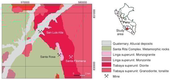 - Steinmüller, K. Depósitos Metálicos en el Peru. Su Metalogénia, sus Modelos, su Exploración y el Medio Ambiente; INGEMMET: Lima, Peru, 1999; p. 171. [Google Scholar]