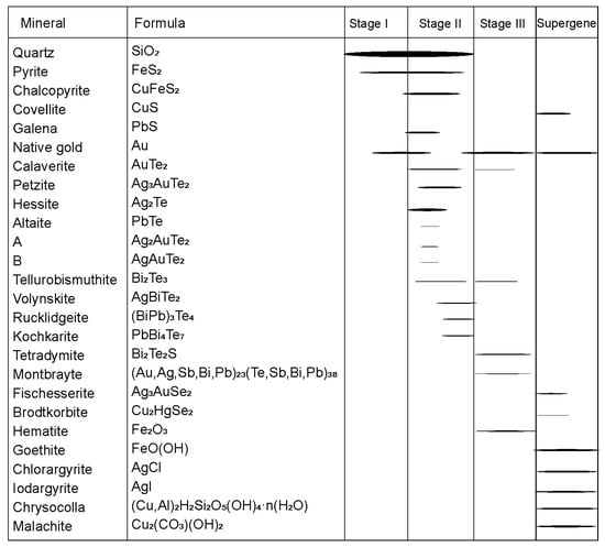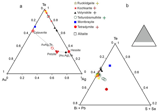 - Cabri, L.J. Phase relations in the Au-Ag-Te systems and their mineralogical significance. Econ. Geol. 1965, 60, 1569–1606. [Google Scholar] [CrossRef]