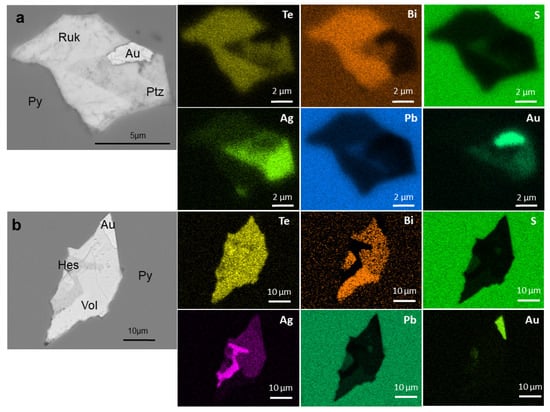 - Roberts, J.A.; Groat, L.A.; Spry, P.G.; Cempírek, J. Telluride Mineralogy of the Deer Horn Au-Ag-Te-(Bi-Pb-W) Deposit, British Columbia: Implications for the Generation of Tellurides. Can. Miner. 2021, 60, 989–1011. [Google Scholar] [CrossRef]
