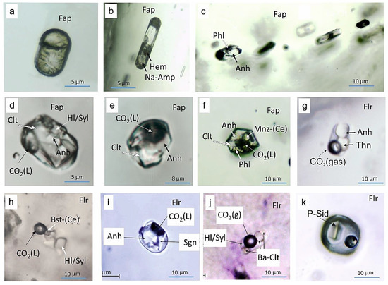 - Redina, A.A.; Doroshkevich, A.G.; Veksler, I.V.; Wohlgemuth-Ueberwasser, C.C. Fluorite Mineralization Related to Carbonatitic Magmatism in the Western Transbaikalia: Insights from Fluid Inclusions and Trace Element Composition. Minerals 2021, 11, 1183. [Google Scholar] [CrossRef]