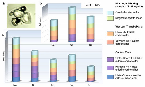 - Prokopyev, I.R.; Borisenko, A.S.; Borovikov, A.A.; Pavlova, G.G. Origin of REE-rich ferrocarbonatites in southern Siberia (Russia): Implications based on melt and fluid inclusions. Mineral. Petrol. 2016, 110, 845–859. [Google Scholar] [CrossRef]