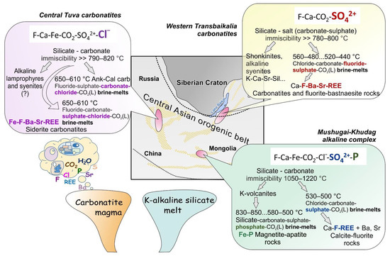 Prokopyev I, Doroshkevich A, Redina A. Brine–Melts and Fluids of the Fe-F-P-(Ba)-(Sr)-REE Central Asian Carbonatite Province (Southern Siberia and Mongolia): The Petrogenetic Aspects. Minerals. 2023; 13(4):573. https://doi.org/10.3390/min13040573