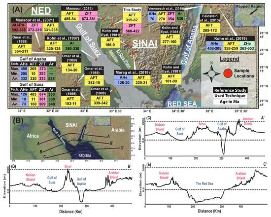(A) Location map based on digital elevation model (www.geomapapp.org, accessed on 25 October 2022) representing the previous thermochronologic studies in the northern ANS and Sinai [6,14,15,17,20,22,23,24]. Where NED = Northeastern Desert; Ar = Ar-Ar dating; ZFT = zircon fission-track, ZHe; zircon (U-Th)/He, AFT = apatite fission-track, and AHe; apatite (U-Th)/He. (B) Digital elevation model (www.geomapapp.org) for the ANS representing the location of topographic cross sections (C) across the ANS in NED, the Gulf of Suez, the northern exposure of the ANS in Sinai, the Gulf of Aqaba, and the ANS in northern Arabia, (D) across the ANS in NED, the Gulf of Suez, the southern exposure of the ANS in Sinai, the Gulf of Aqaba, and the ANS in northern Arabia, (E) across the ANS in CED, the Red Sea, and the ANS in central Arabia.