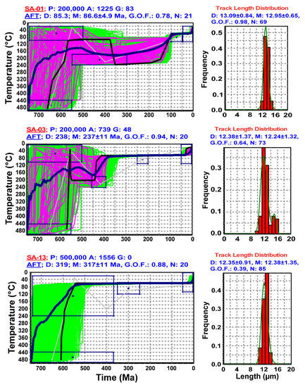 The t–T models categorize the cooling scenarios for the studied region into three different possibilities: (1) Sample SA-13 (Figure 4), which experienced the first rapid cooling event during the Neoproterozoic, then a period of slow reheating to stable temperature, which extended until the Late Oligocene when the sample was exhumed to its current elevation (Figure 4). (2) Sample SA-03 (Figure 4), which experienced the first rapid cooling event during the Neoproterozoic to exhume the sample closer to the surface. Then, the sample experienced a reheating event extended till the Devonian–Carboniferous, when a second rapid cooling event affected the sample uplifting it to the upper part of the AFT PAZ. Then, the sample experienced a period of thermal stability until the Oligocene–Miocene, when it was exhumed to its current elevation (Figure 4). (3) Sample SA-01 (Figure 4), which experienced the first rapid cooling event during the Neoproterozoic to exhume a sample closer to the surface. Then, the sample experienced a reheating event which might have extended until the Cretaceous, when a second rapid cooling event affected the sample during the Jurassic–Cretaceous, raising it to the AFT PAZ. Then, the sample experienced a relatively short period of thermal stability until the Oligocene–Miocene, when it was exhumed to its current elevation (Figure 4).