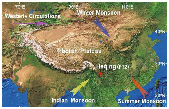 The Asian monsoon is an important part of the global climate system. It connects climate change across high, middle, and low latitudes and affects the local environment and humanity through events such as rainfall or weather disasters [1]. The mechanism driving the Asian monsoon is related to the seasonal migration of the intertropical convergence zone (ITCZ). The Asian monsoon is also influenced by sea–land thermal differences and the regional topography [2,3]. The Asian monsoon brings abundant heat and moisture inland from low latitudes. People in monsoon areas are affected by monsoon floods [4]. The systematic study of the Asian monsoon can help us understand the processes involved in contemporary climate evolution and help humanity develop a more harmonious relationship with the land [5]. When studying the Asian monsoon, studies of the southwest monsoon (Indian monsoon) that encompass long-time scales and have high resolutions are essential. The Heqing basin, located on the southeast edge of the Tibetan Plateau uplift zone, consists of a structural fault within a subsidence basin. It is not only a transitional zone between the Tibetan Plateau and the subtropical lowlands but also a transitional area between the Indian monsoon region and the southeast monsoon region. The Heqing basin contains thick lacustrine sediment, which provides an excellent opportunity to explore the evolution of the Indian monsoon and the uplift of the Tibetan Plateau [6,7,8].